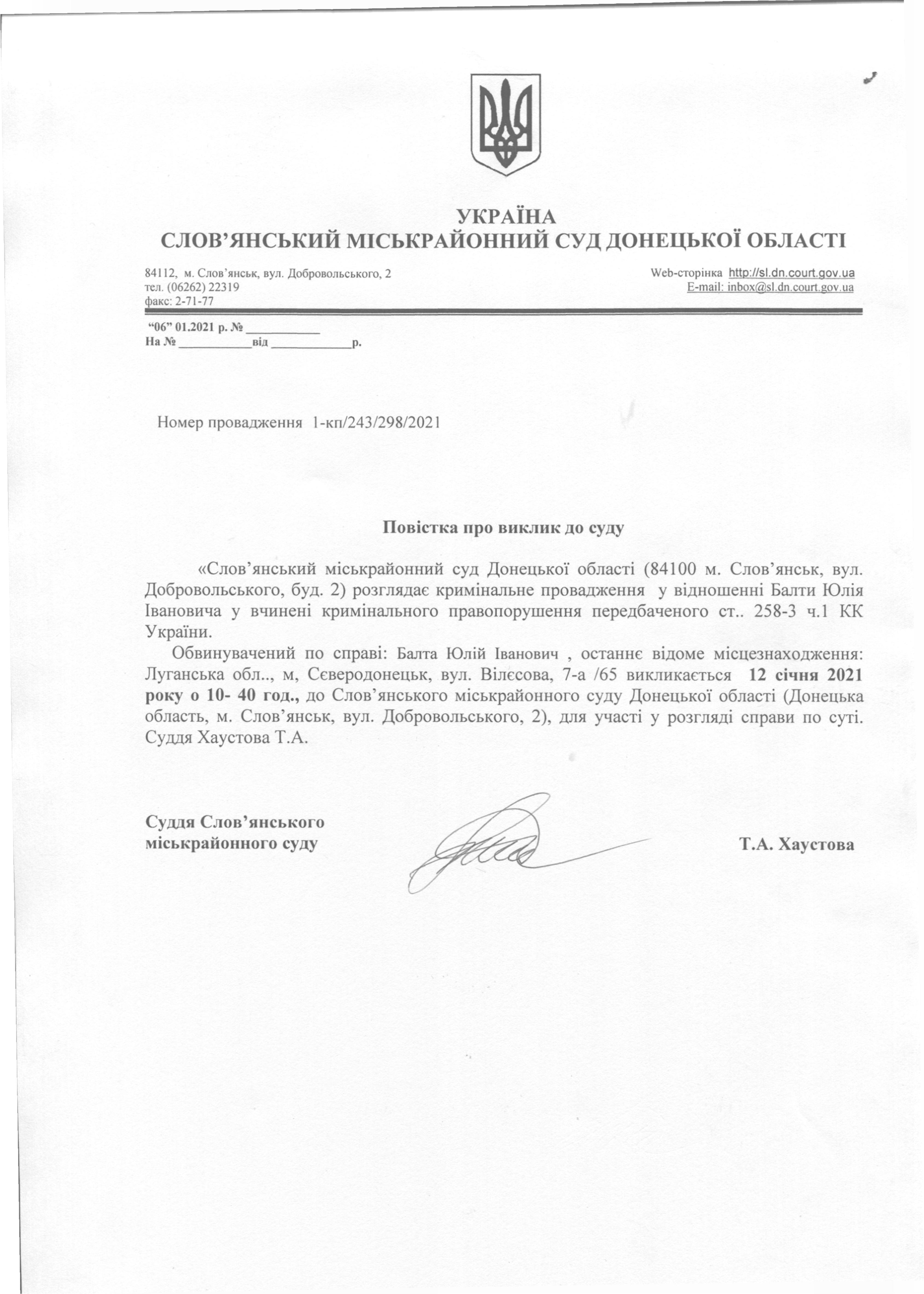 Повістка про виклик до суду у відношенні Балти Ю.І.