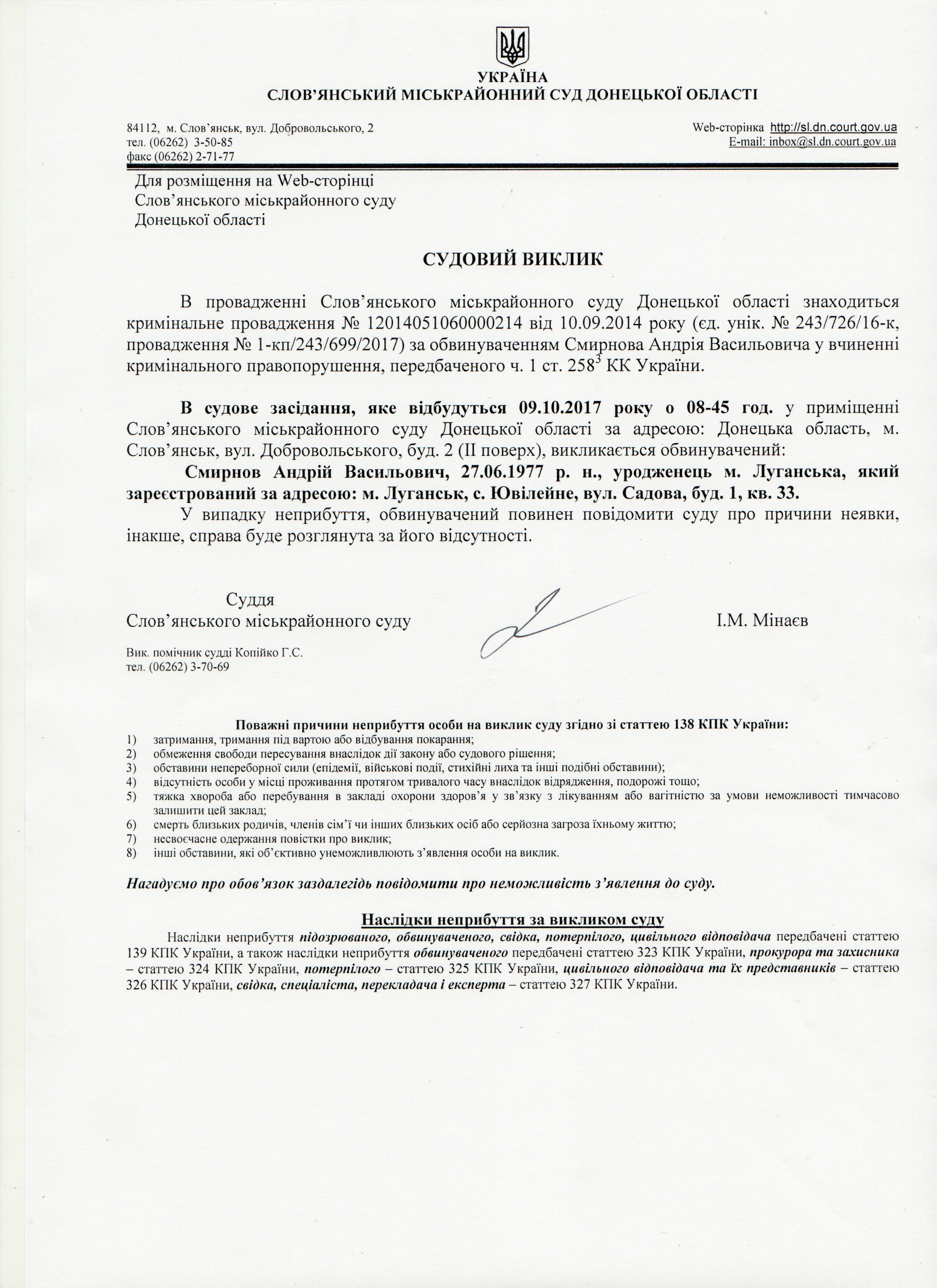 Оголошення по кримінальному провадженню №12014051060000214 від 10.09.2014 за обвинуваченням Смирнова А.В. у вчиненні кримінального правопорушення, передбаченого ч.1 ст.258-3 КК України