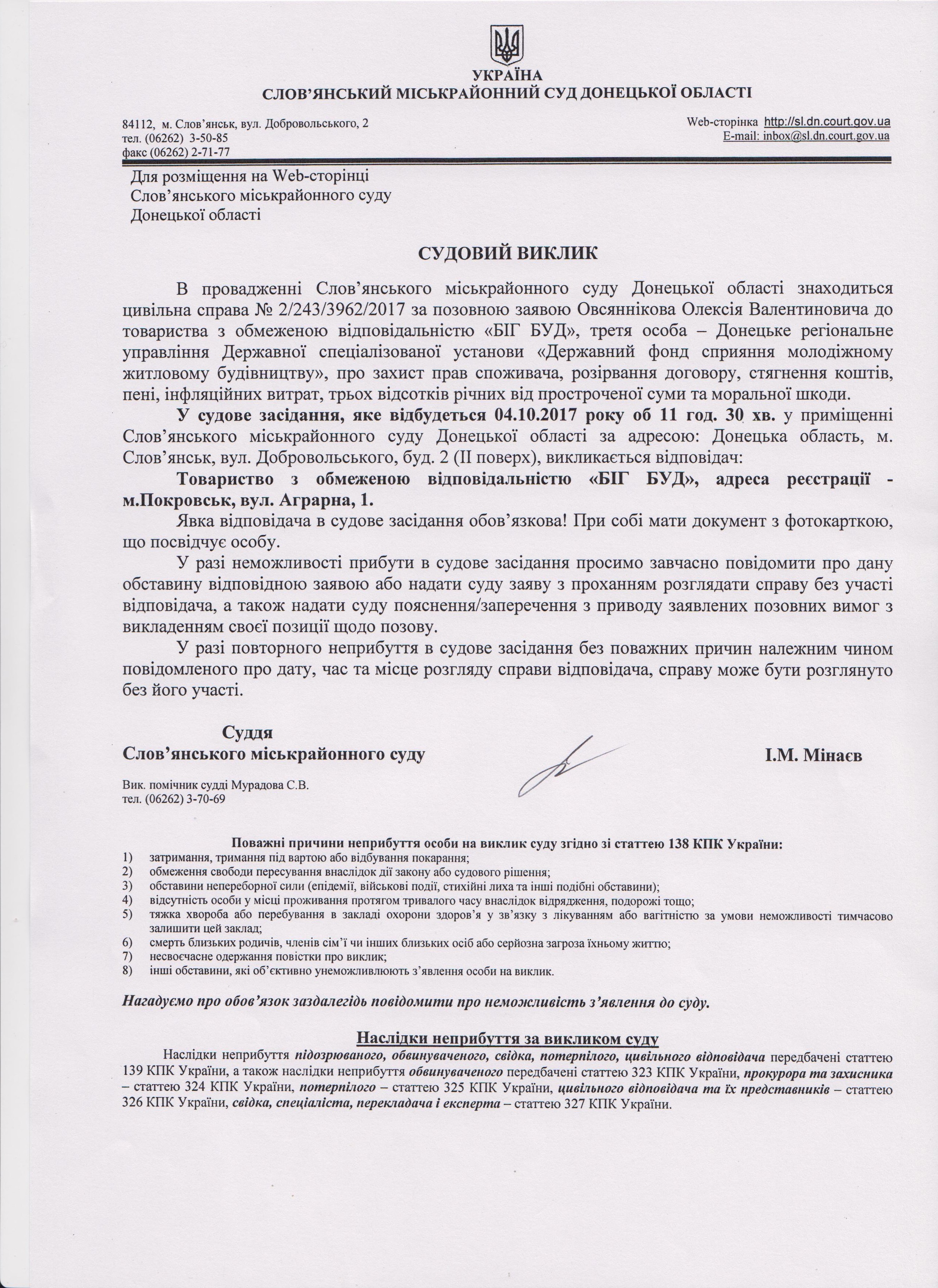 Оголошення по справі № 2/243/3962/2017 за позовною заявою Овсяннікова Олексія Валентиновича до товариства з обмеженою відповідальністю «БІГ БУД».