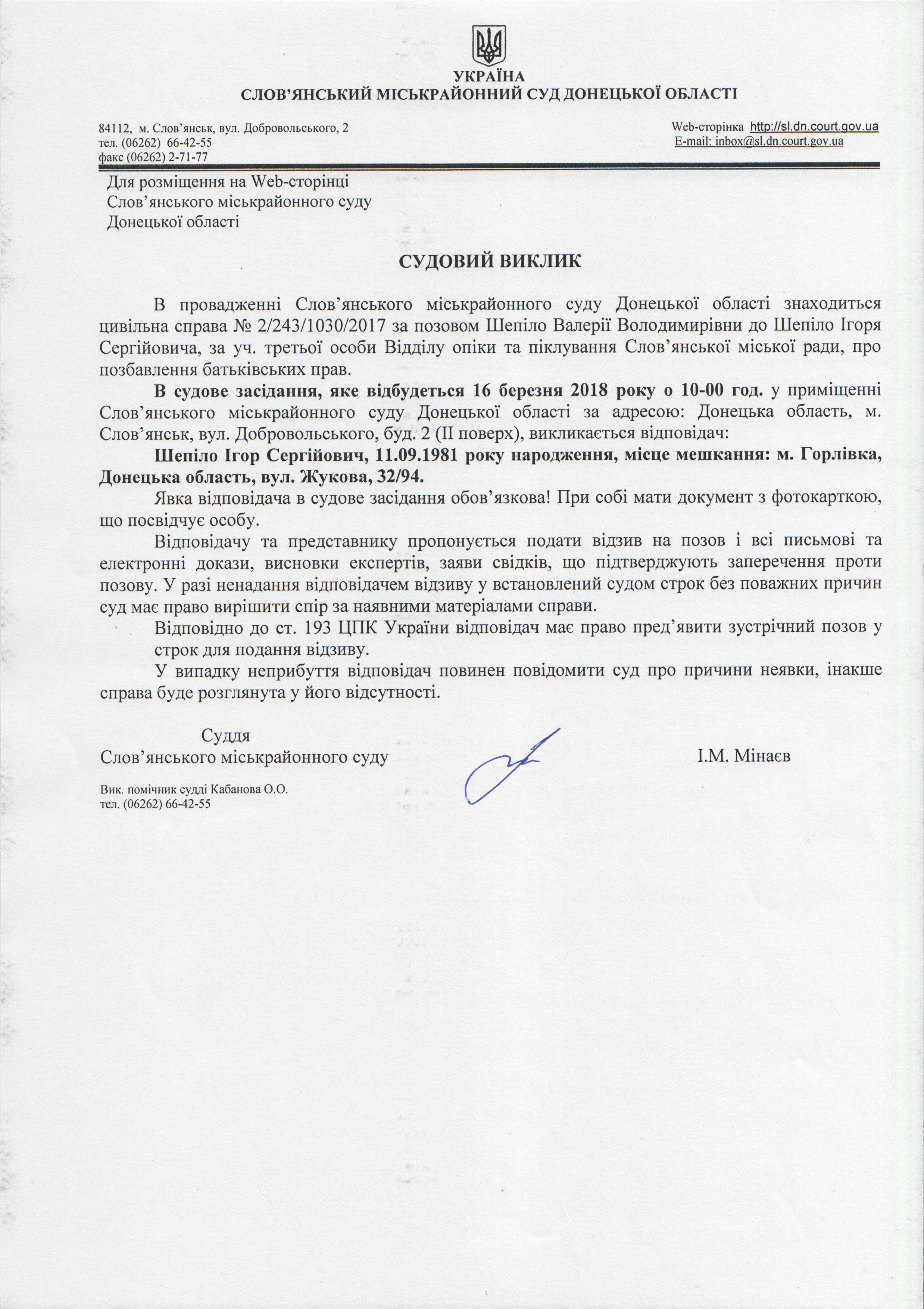 Оголошення по цивільній справі №2/243/1030/2017 за позовом Шепіло В.В. до Шепіло І.С., за участю третьої особи Відділу опіки та піклування Слов'янської міської ради, про позбавлення батьківських прав.