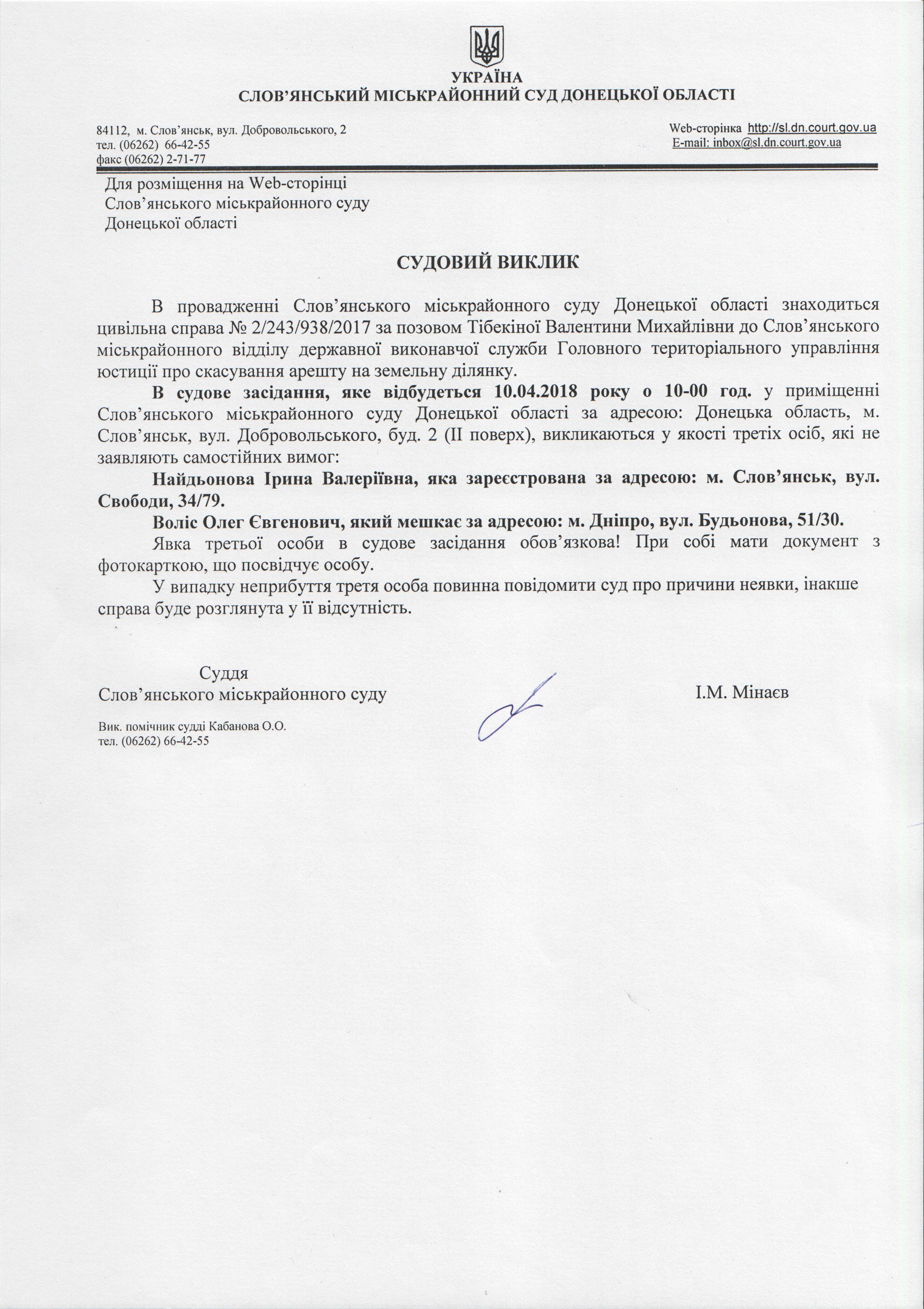 Оголошення по цивільній справі №2/243/938/2017 за позовом Тібекіної В.М. до Слов'янського міськрайонного відділу державної виконавчої служби Головного територіального управління юстиції про скасування арешту на земельну ділянку.