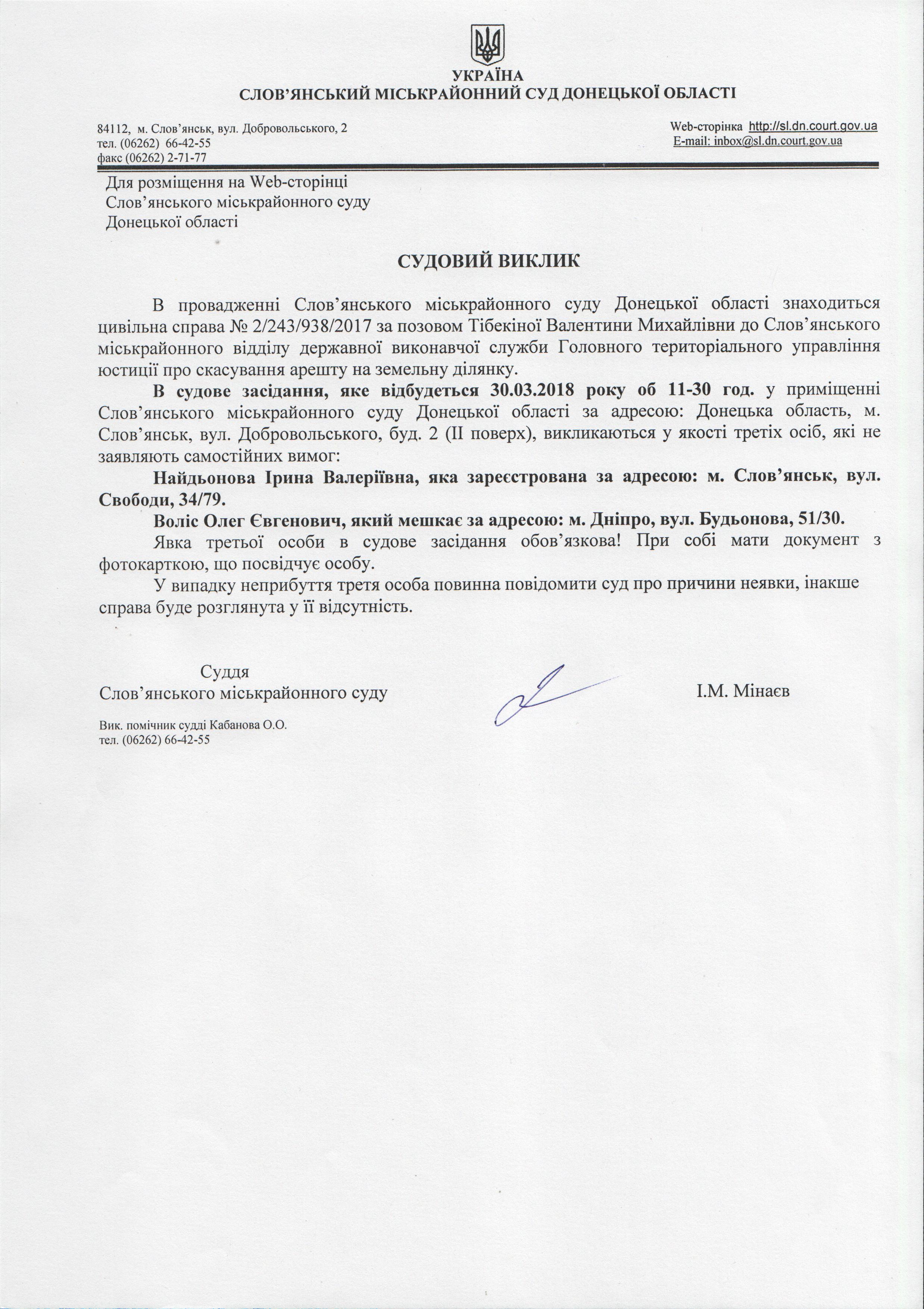 Оголошення по цивільній справі №2/243/938/2017 за позовом Тібекіної В.М. до Слов'янського міськрайонного відділу державної виконавчої служби Головного територіального управління юстиції про скасування арешту на земельну ділянку.