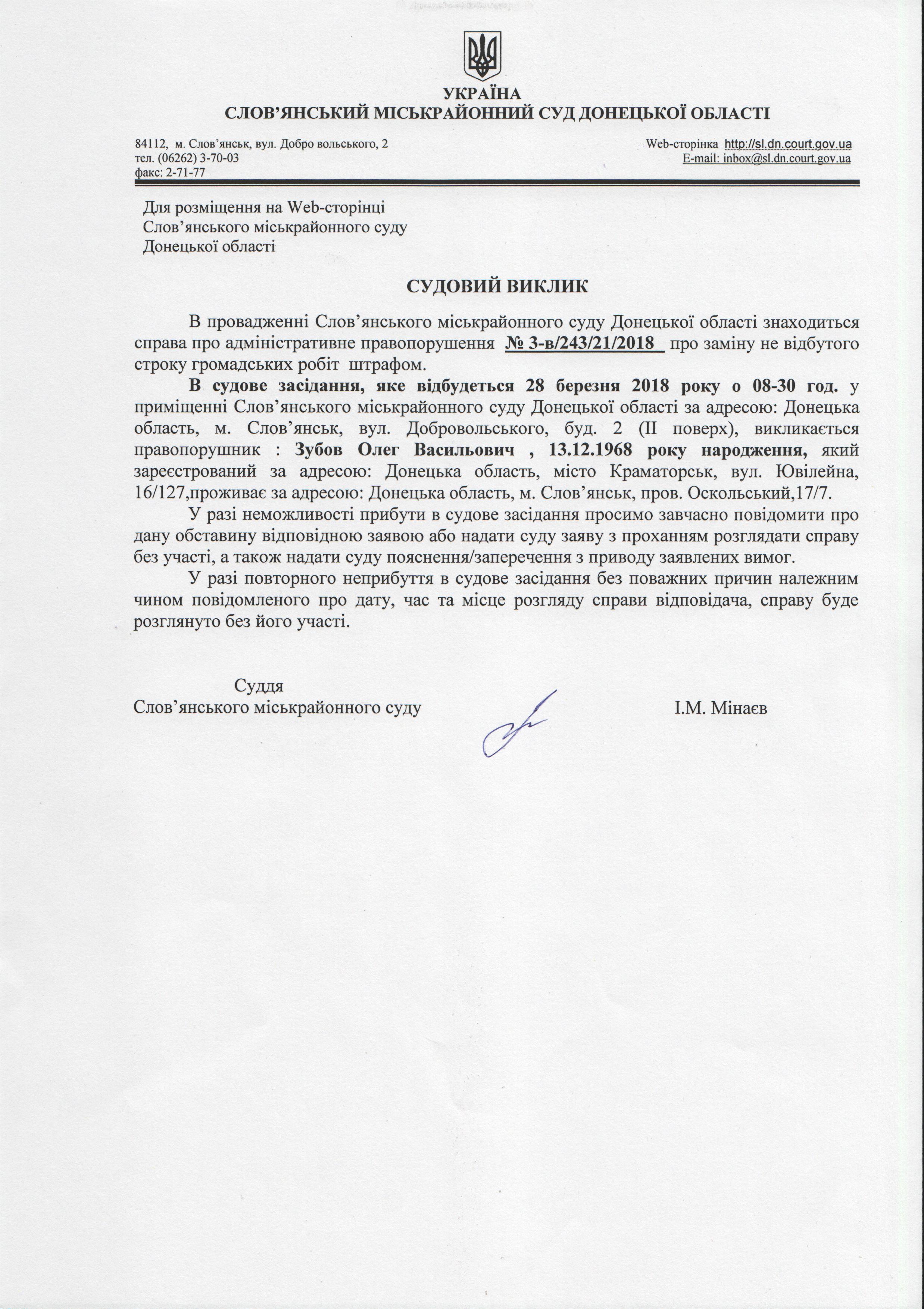 Оголошення по справі про адміністративне правопорушення №3-в/243/21/2018 про заміну не відбутого строку громадських робіт штрафом.