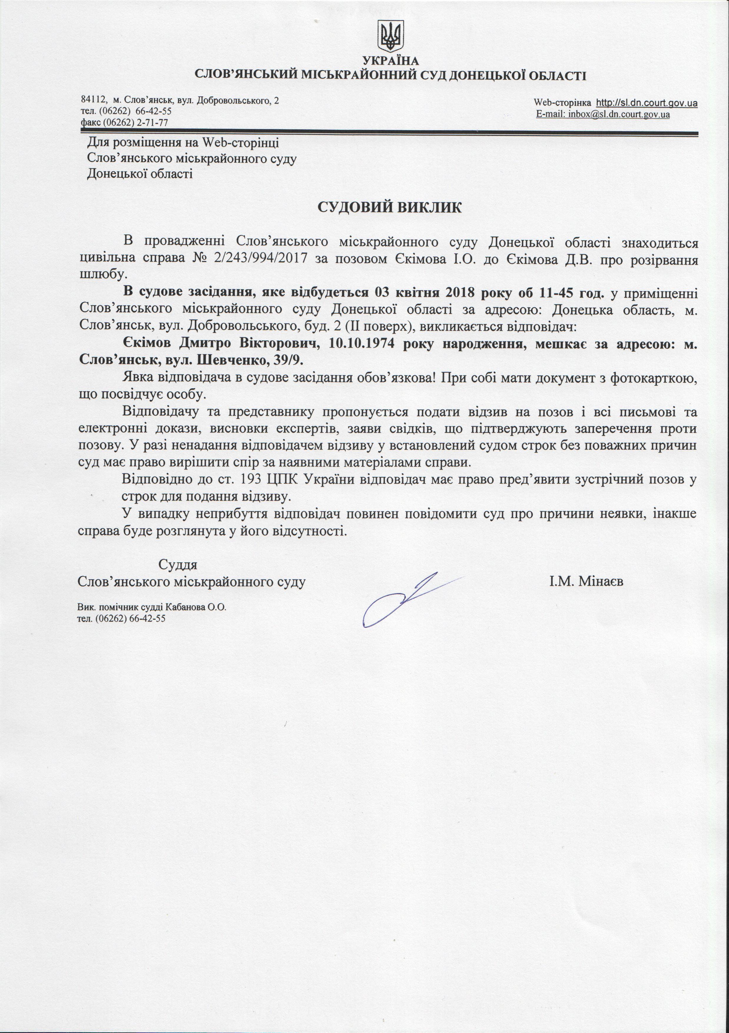 Оголошення по цивільній справі №2/243/994/2017 за позовом Єкімова І.О. до Єкімова Д.В. про розірвання шлюбу.