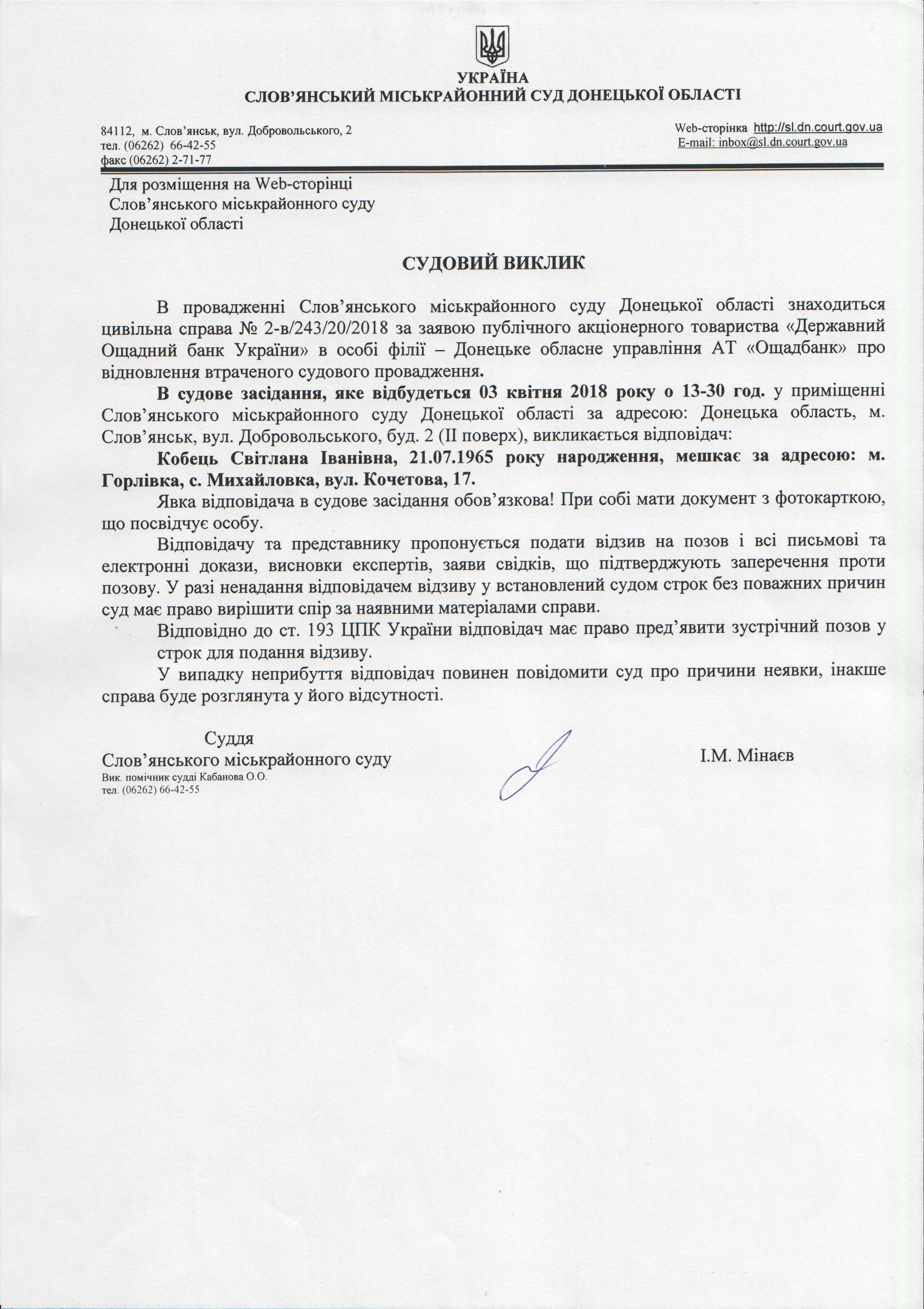 Оголошення по цивільній справі №2-в/243/20/2018 за заявою ПАТ "Державний Ощадний банк України"