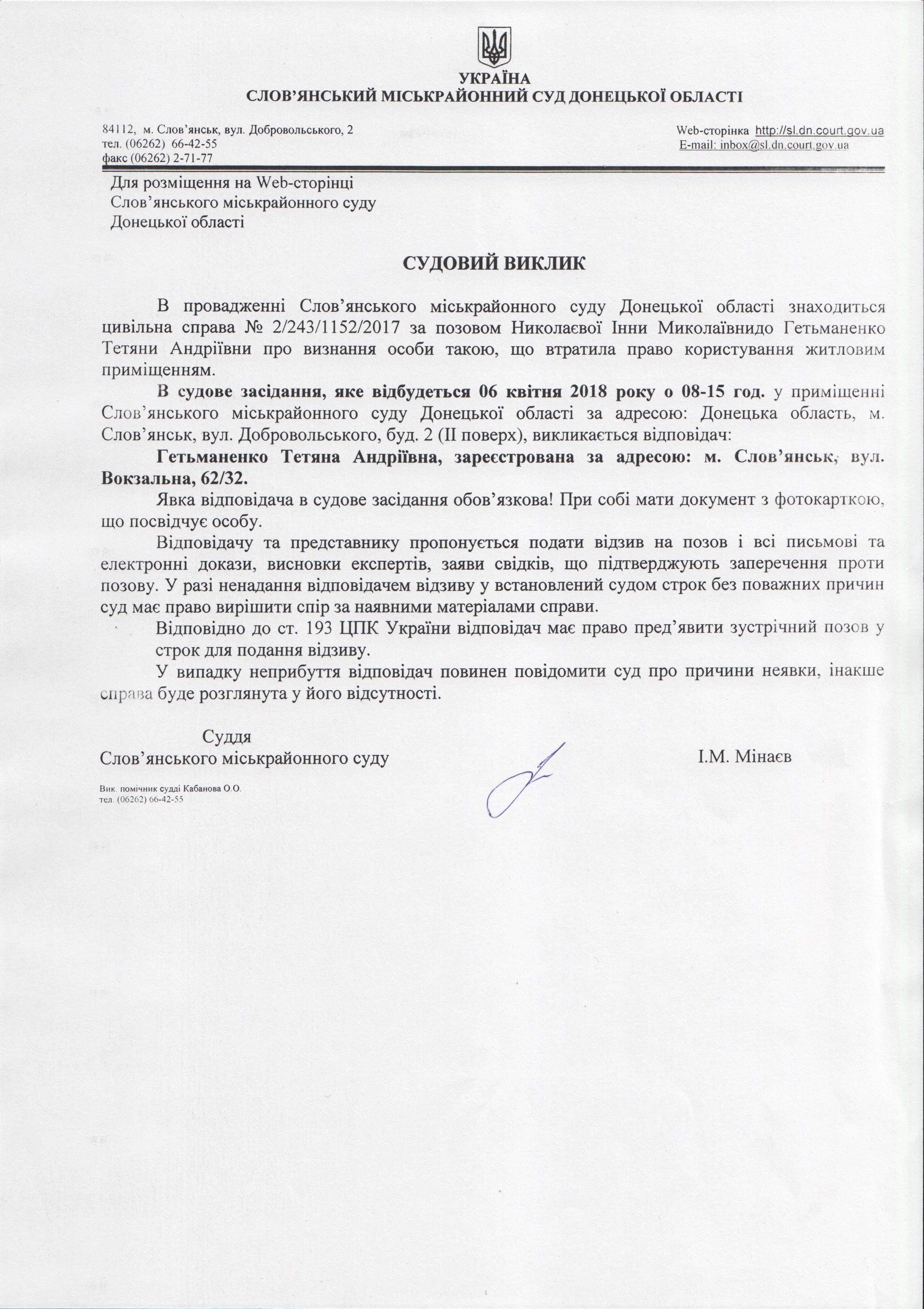 Оголошення по цивільній справі №2/243/1152/2017 за позовом Николаєвої І.М. Гетьманенко Т.А. про визнання особи такою, що втратила право користування житловим приміщенням.