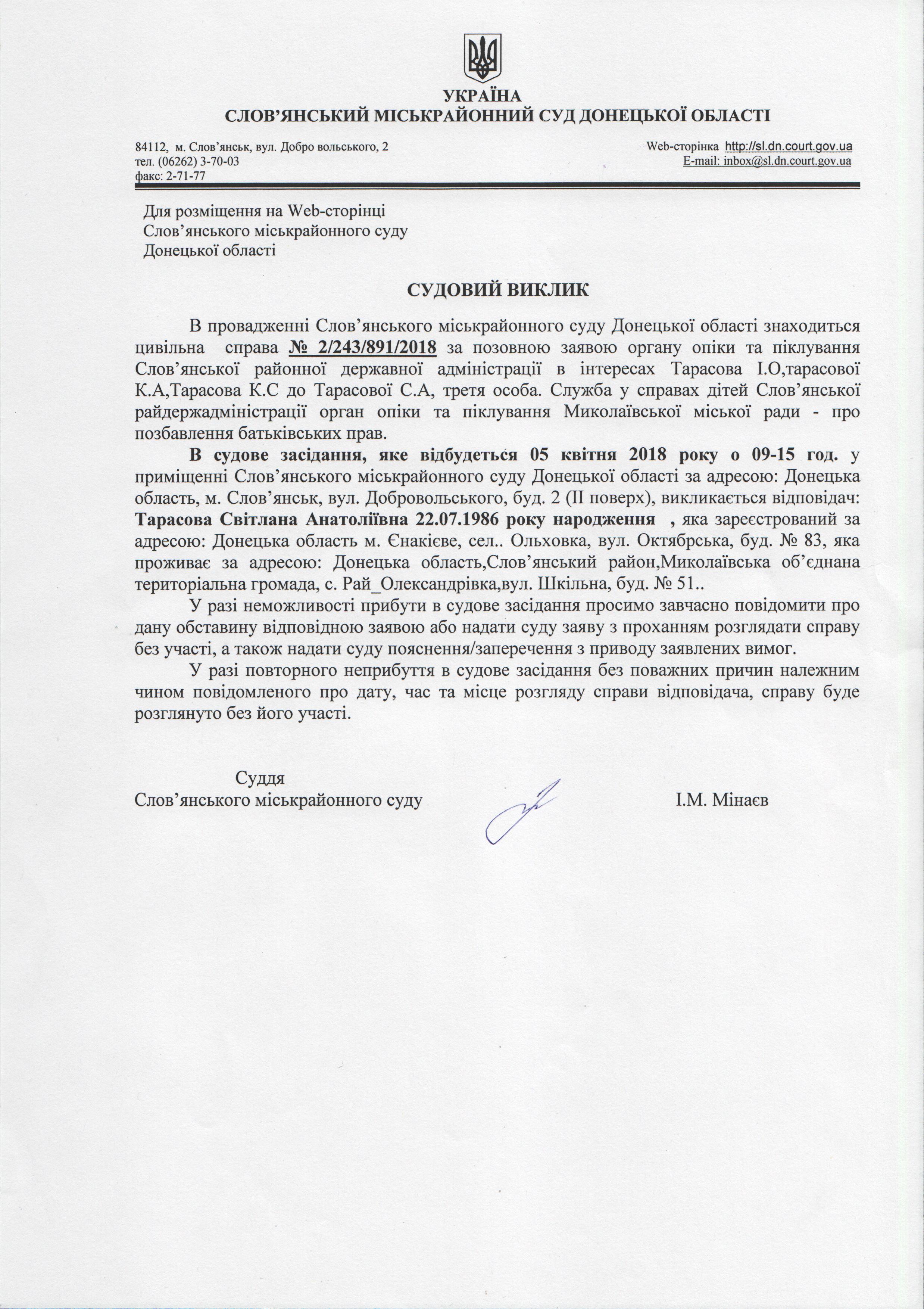 Оголошення по цивільній справі №2/243/891/2018 за позовом органу опіки та піклування Слов'янської районної державної адміністрації в інтересах Тарасова І.О., Тарасової К.А., Тарасова К.С. до Тарасова С.А., третя особа.