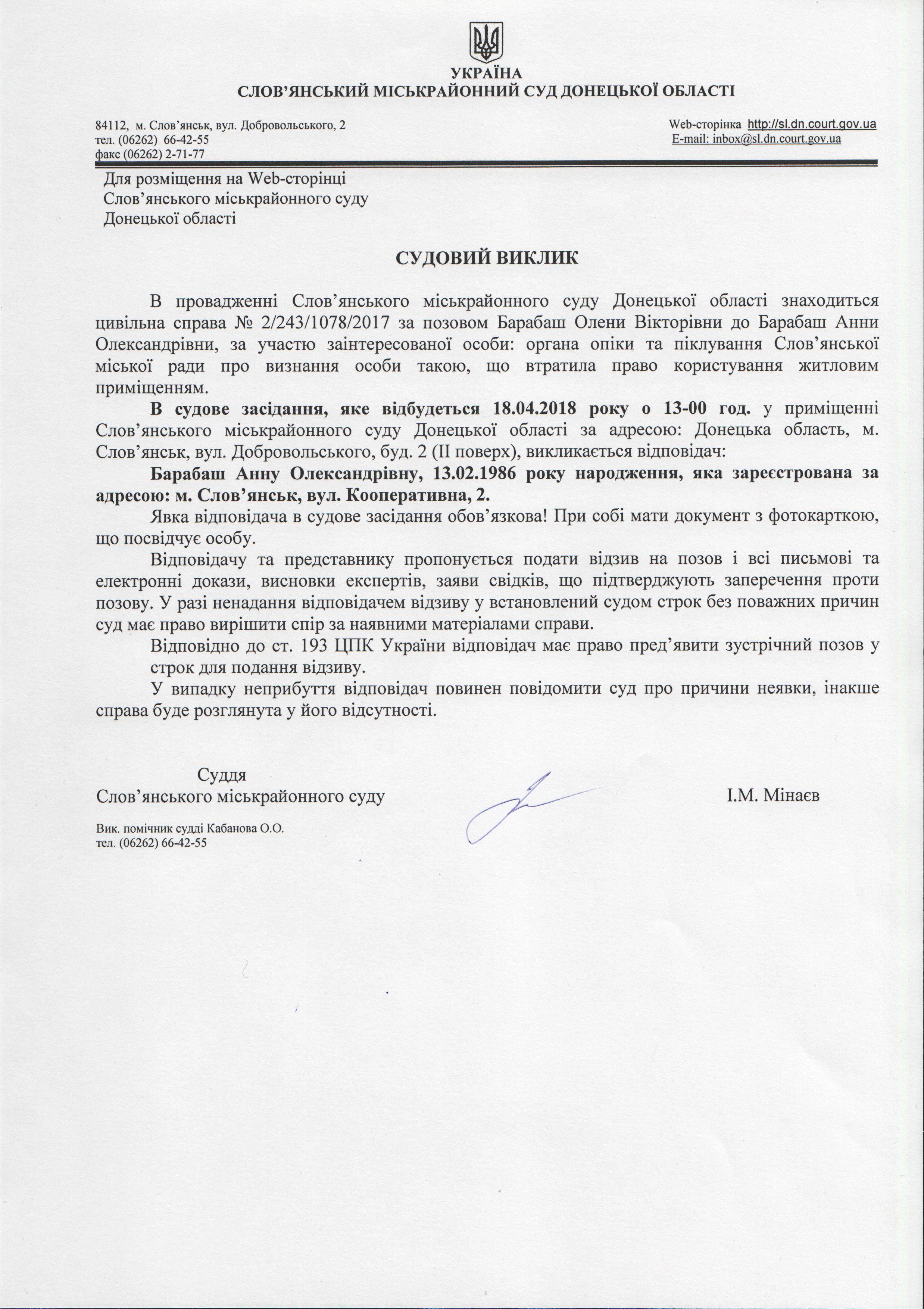 Оголошення по цивільній справі №2/243/1078/2017 за позовом Барабаш О.В. до Барабаш А.О., за участю заінтересованої особи: органи опіки та піклування Слов'янської міської ради