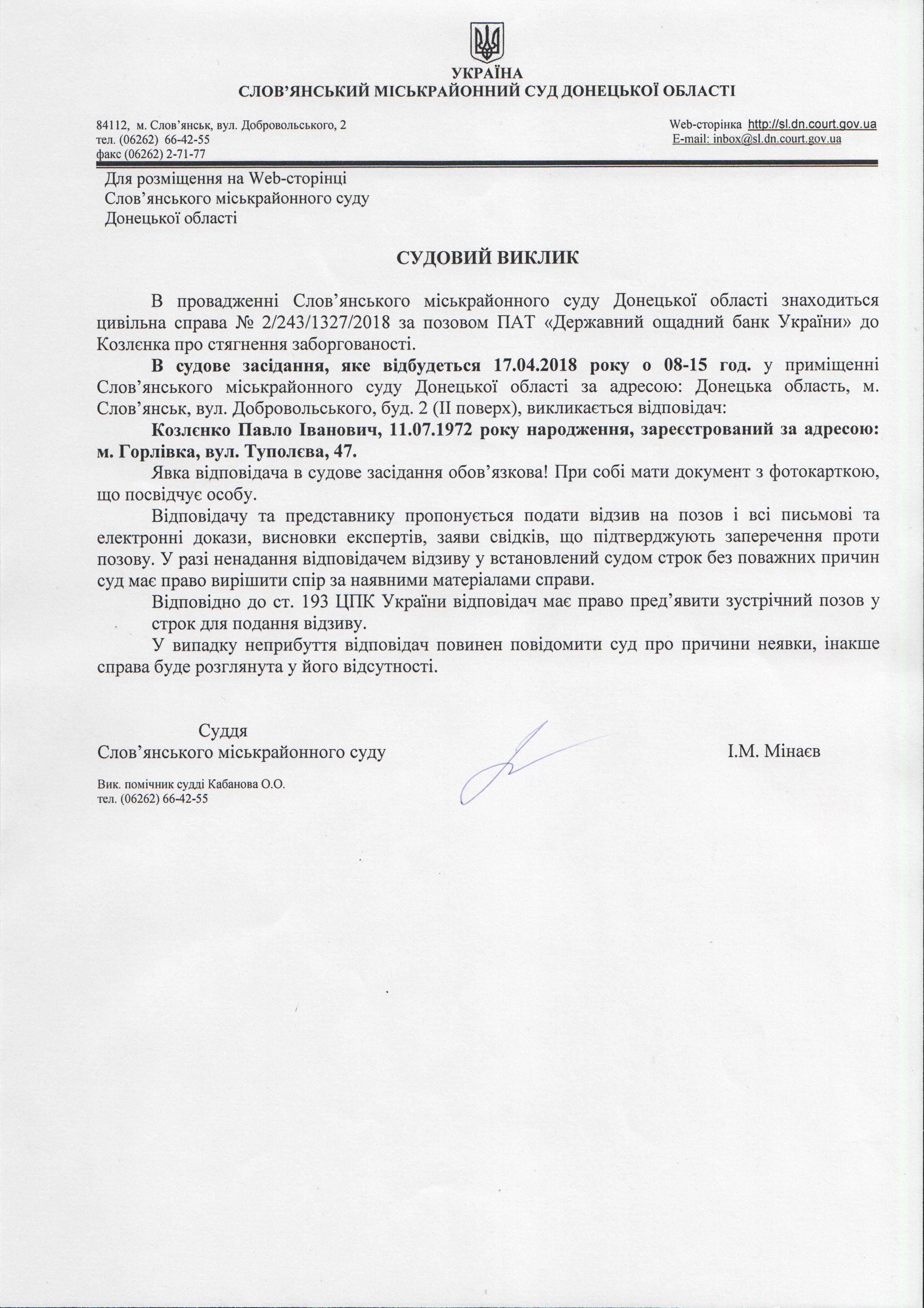 Оголошення по цивільній справі № 2/243/1327/2018 за позовом ПАТ "Державний ощадний банк України" до Козлєнка про стягнення заборгованості