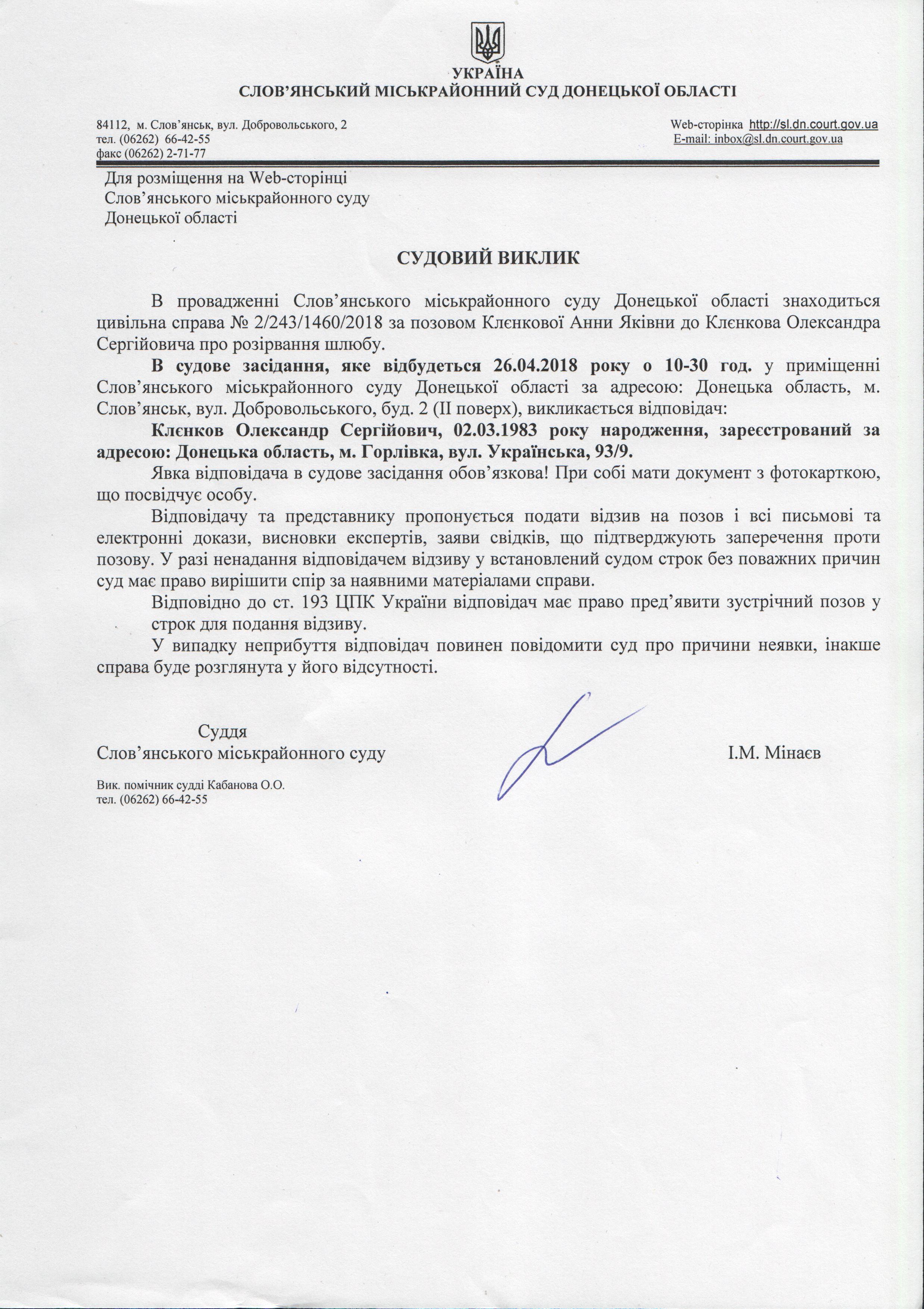 Оголошення по цивільній справі №2/243/1460/2018 за позовом Клєнкової А.Я. до Клєнкова О.С. про розірвання шлюбу.