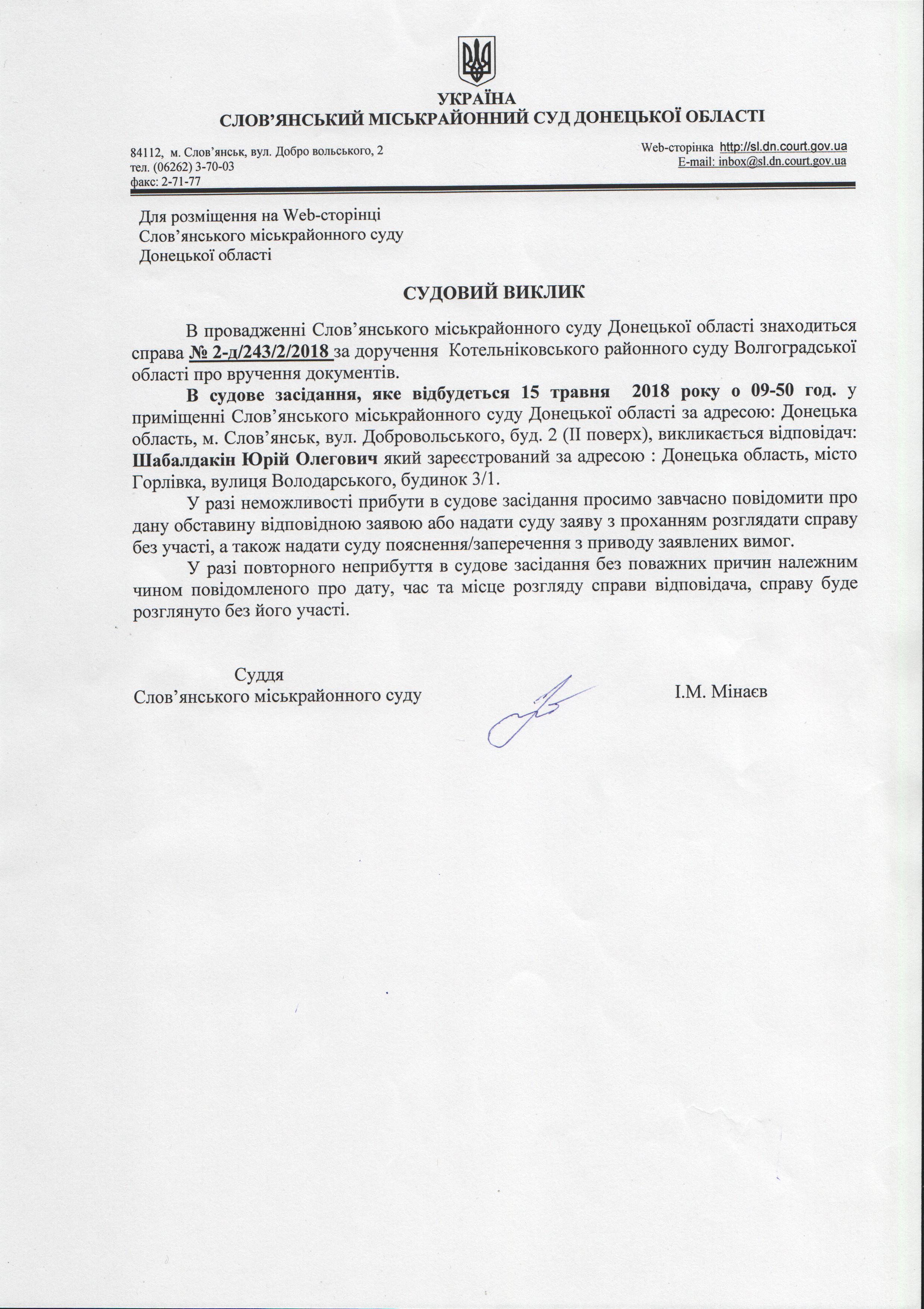 Оголошення по справі №2-д/243/2/2018 за дорученням Котельніковського районного суду Волгоградської області про вручення документів