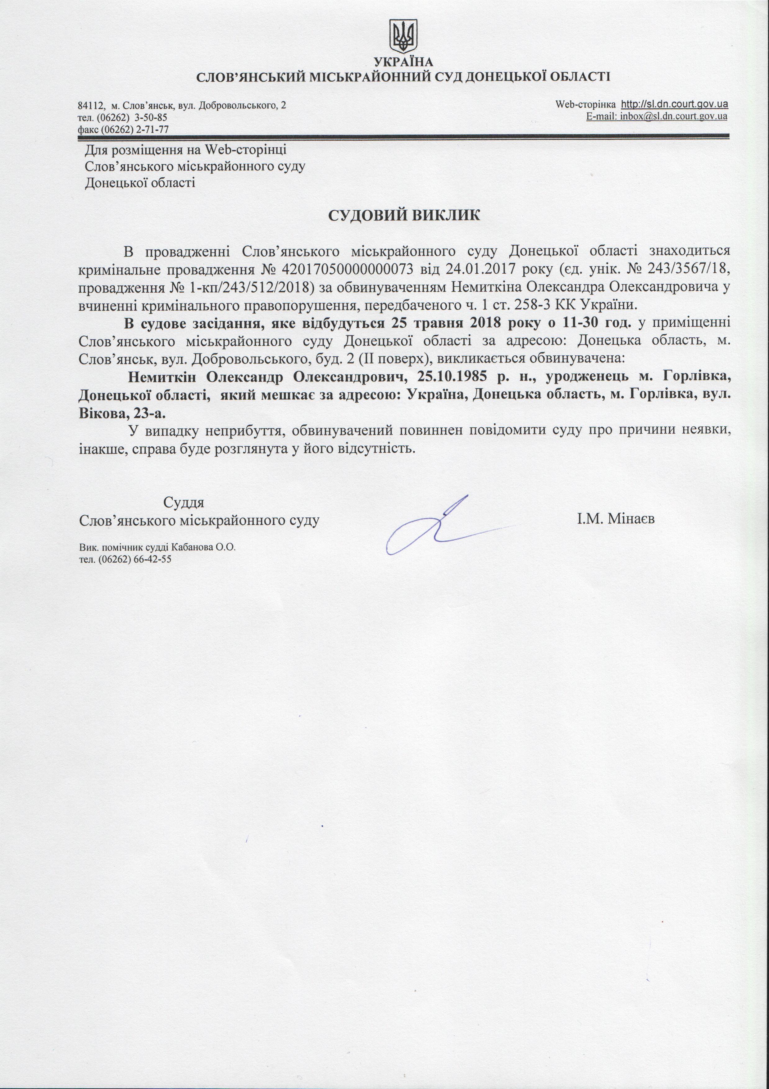 Оголошення по кримінальній справі №1-кп/243/512/2018 за обвинуваченням Немиткіна Олександра Олександровича у вчиненні кримінального правопорушення , пердбаченого ч.1 ст.258-3 КК України