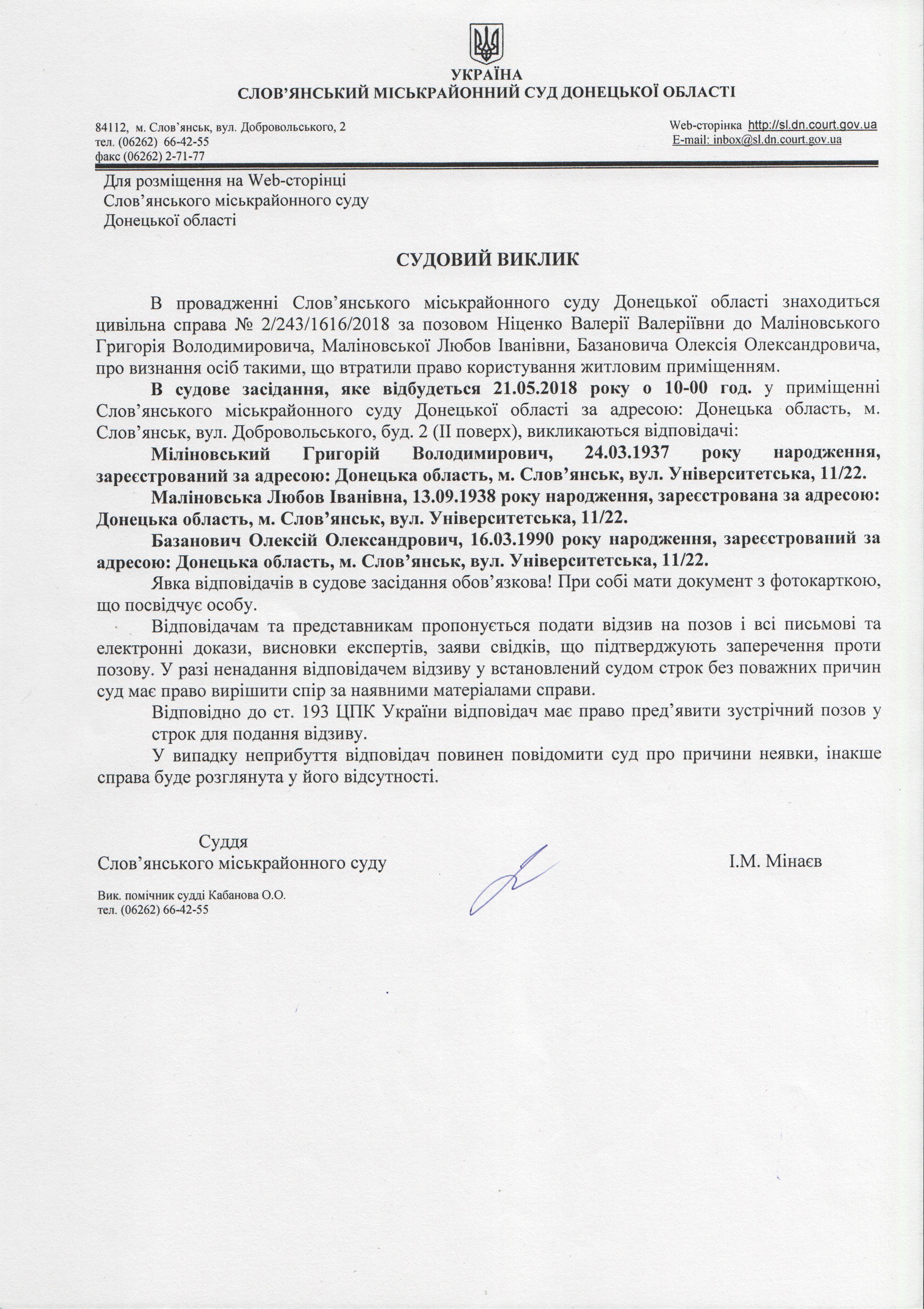 Оголошення по цивільній справі №2/243/1616/2018 за позовом Ніценко Валерії до Маліновського Григорія Володимировича, Маліновської Любов Іванівни, Базановича Олексія Олександровича.