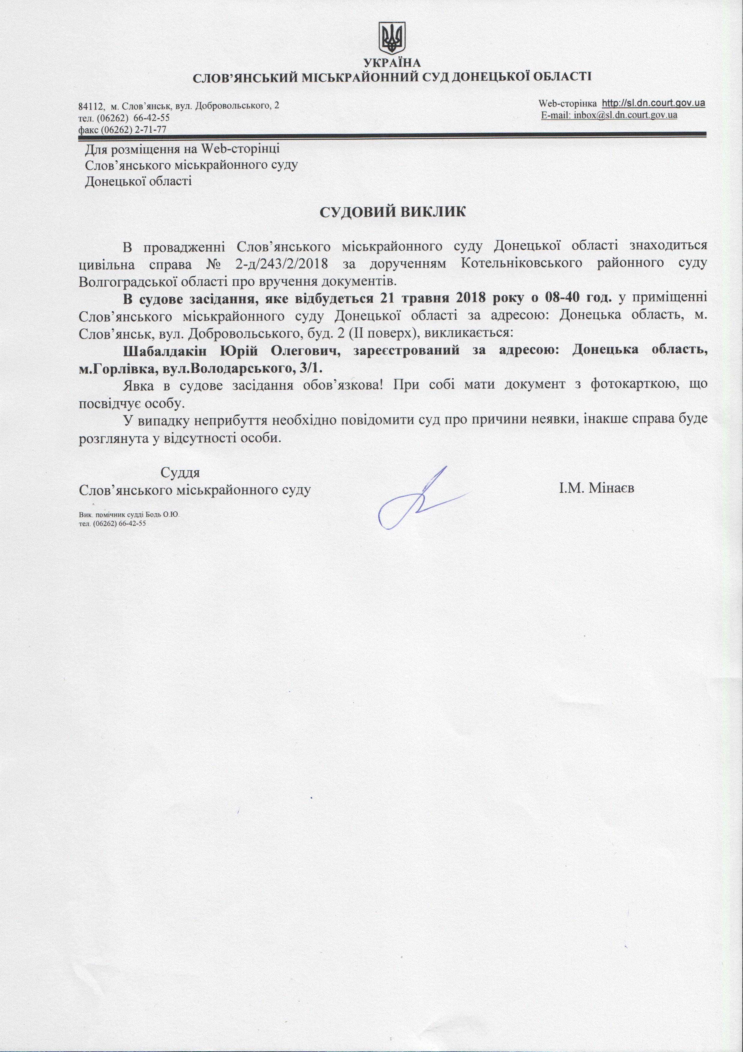 Оголошення по цивільній справі №2-д/243/2/2018 за дорученням Котельніковського районного суду Волгоградської області про вручення документів.