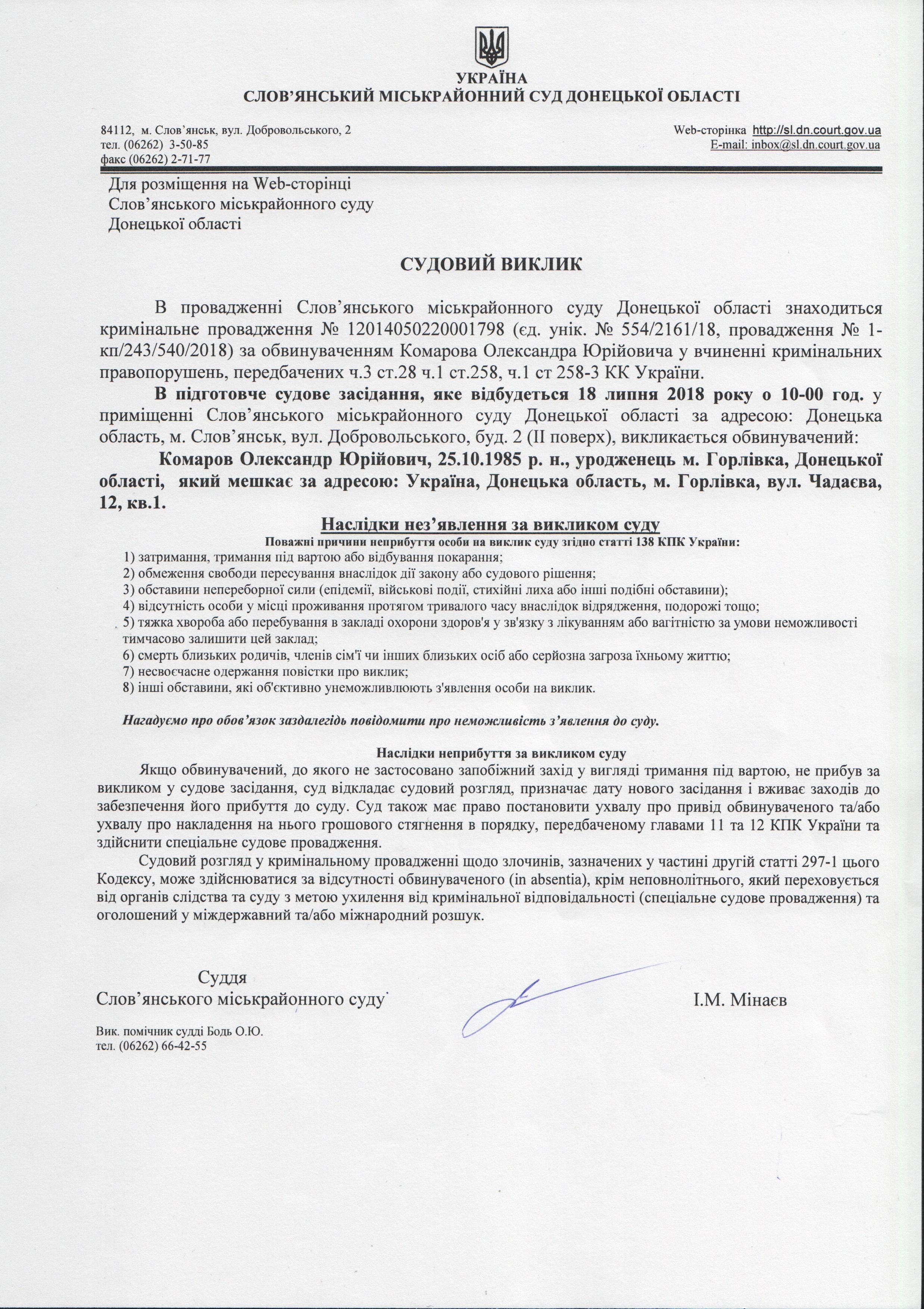 Оголошення по кримінальному провадженню №1-кп/243/540/2018 за обвинуваченням Комарова Олександра Юрійовича у вчиненні кримінальних правопорушень, передбачених ч.3 ст.28 ч.1 ст.258, ч1. ст.258-3 КК України